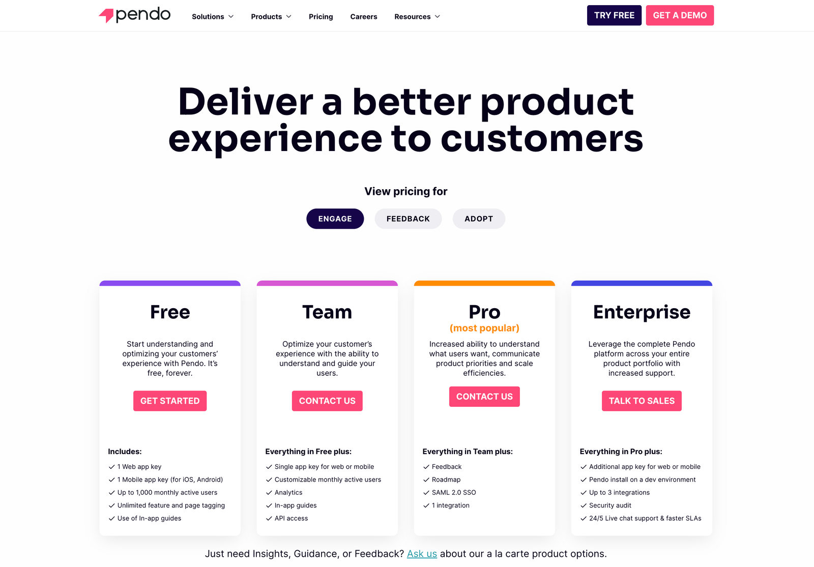 Beyond that, things get murky. Pendo’s Growth and Portfolio plans don’t have public pricing — they’re entirely quote-based. According to Vendr on Pendo pricing, customers typically pay anywhere from $17,000 to $132,000 per year, with a median around $47,000.